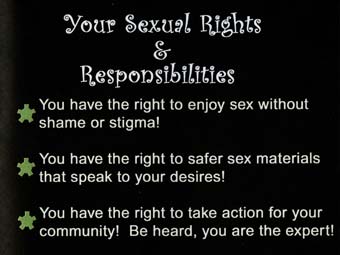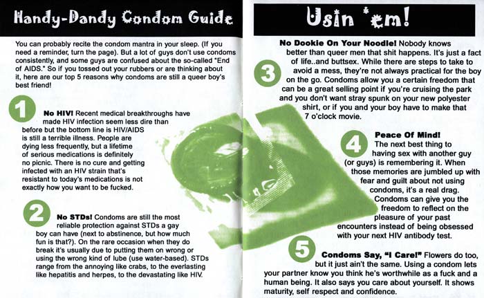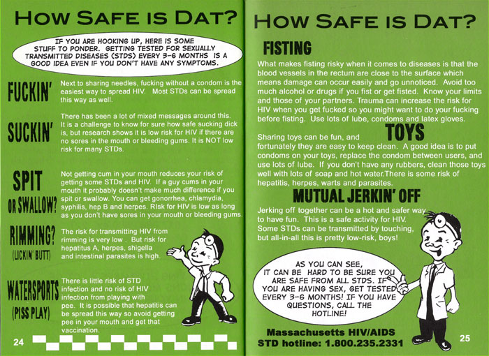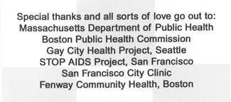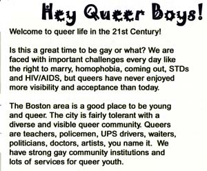 (Caution: extremely gross and disgusting. We debated posting this in unedited form; we did so because it was given to schoolchildren (adolescent boys) in a public school, written with public money. Unfortunately, it's necessary that the public see it.) "The Little Black Book - Queer in the 21st Century""The Little Black Book - Queer in the 21st Century." Handed out at Brookline High School during GLSEN event April 30, 2005. Is this the future? This booklet was distributed to hundreds of kids (middle school age and up) at Brookline High School, Brookline, MA, on April 30, 2005. It was written by the Boston-based AIDS Action Committee, with help with the Massachusetts Department of Public Health and the Boston Public Health Commission. The event that day was designed for children and their teachers across Massachusetts, organized by the "Gay Lesbian and Straight Education Network" (GLSEN). This is the group that runs "Gay-Straight Alliance" clubs in public schools across the country. You must ask yourself: What kind of person would write this? What kind of person would give it to kids? Where is this movement headed? Click here for the full report of the event, including photos, news reports, Governor's statement, and more. Here's the reaction from a medical expert on sexual transmitted diseases: click here. We've posted parts of this book below, or you can View and download the full version of the book Front Cover Acknowledgements