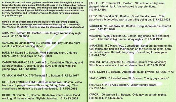 As the text says, "Here is a list of Boston area bars and clubs for the discerning queerboy."