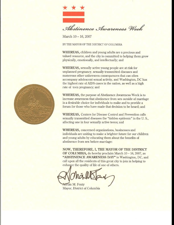 A special thank you goes out to Mayor Adrian Fenty for proclaiming the week of March 10-17, as Abstinence Awareness Week. Let’s do it again!