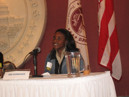 Simi Akinwande represented ULTRA Teen Choice at the 8th Washington Times Citizens Forum. The topic was "The root causes of the rising AIDS trend in Washington, D.C.: How do we educate our community to take responsible action while developing effective social services?" . The panel included the head of the DC Department of Health, and the speakers included Congresswoman Eleanor Holmes Norton and Charles Ssentongo from the embassy of Uganda. Simi spoke up for abstinence as the only 100% sure way to protect our youth from the epidemic of HIV/AIDS and sexually transmitted diseases. Simi stood out as the lone voice on the panel promoting abstinence from sex before marriage as the way to stem the epidemic of HIV/AIDS in Washington, DC. |